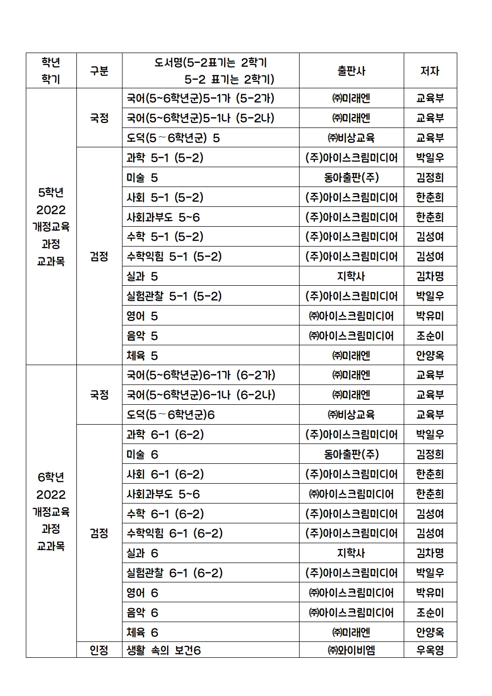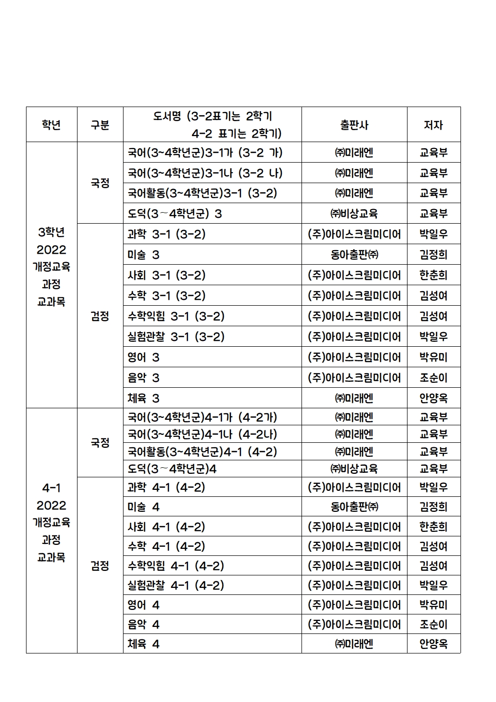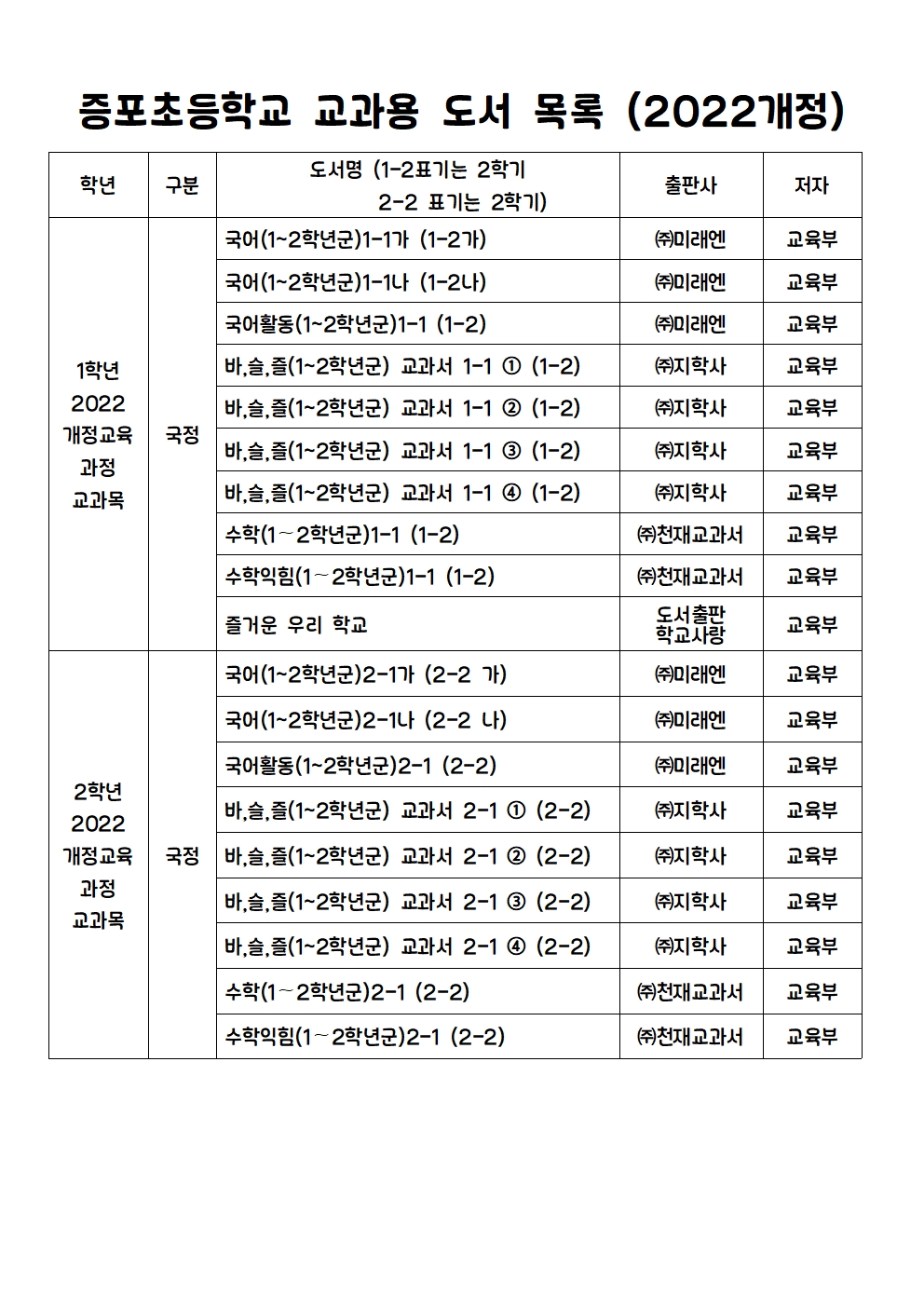 2026학년도 증포초등학교 교과목 도서(교과서목록)