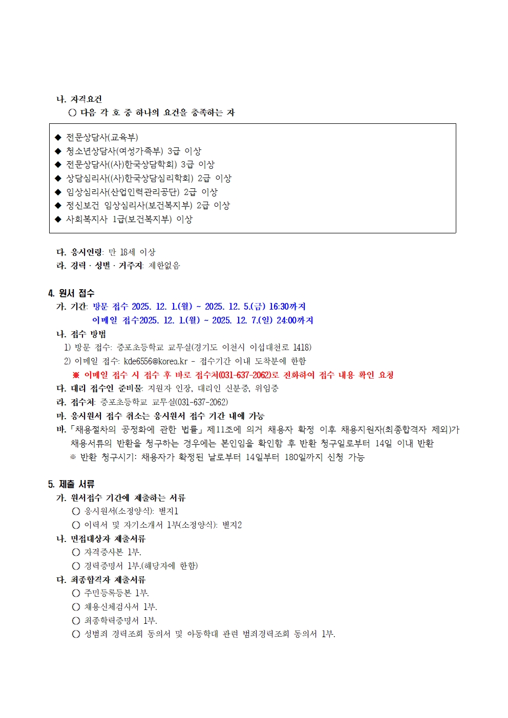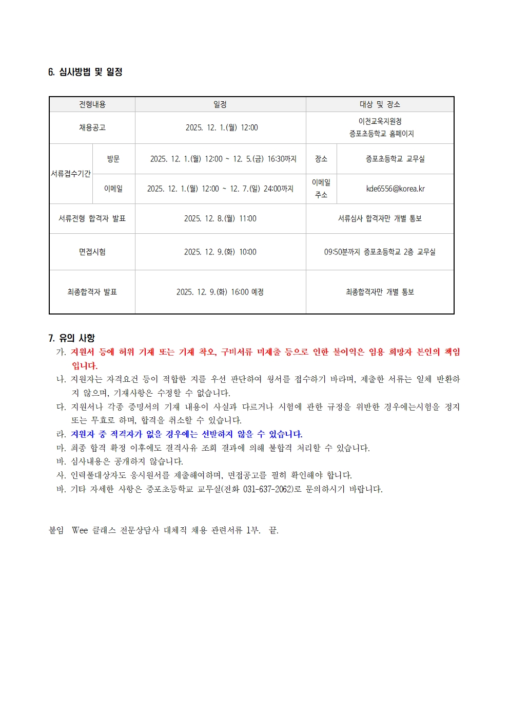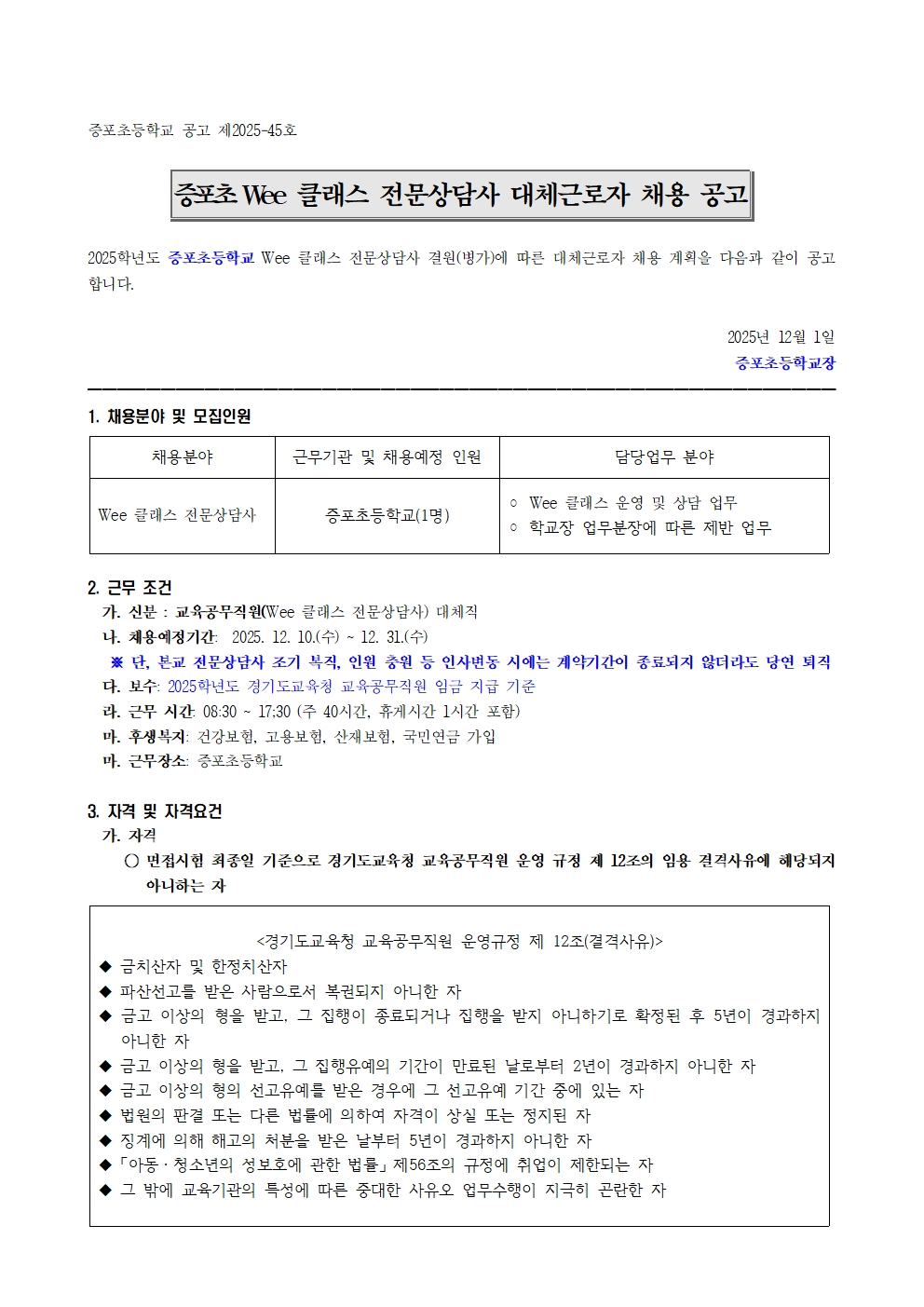 증포초 Wee 클래스 전문상담사 대체근로자 채용 공고